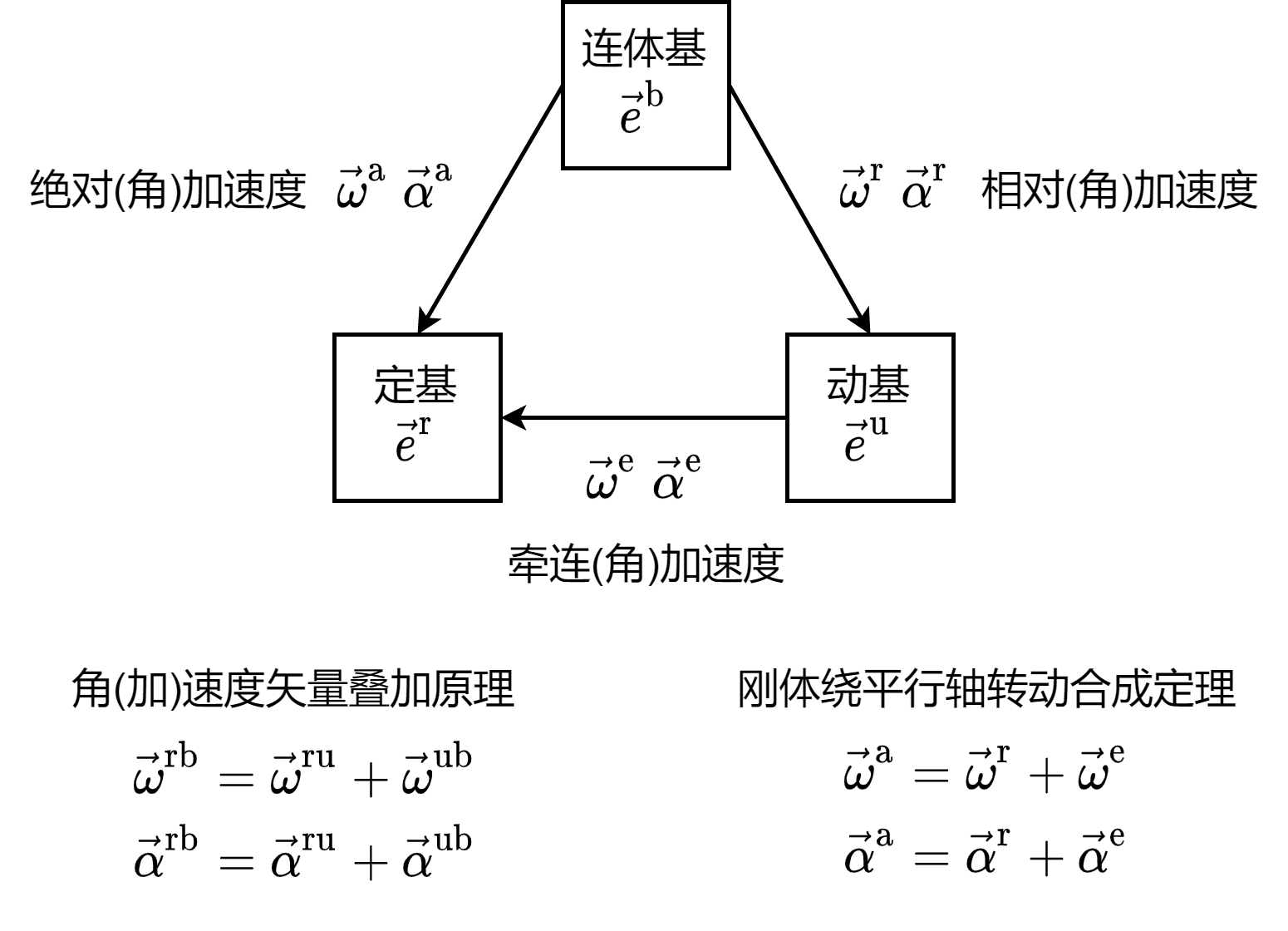 - 若有三个基 $\vec{\boldsymbol{e}}^{\mathrm{r}}$,$\vec{\boldsymbol{e}}^{\mathrm{b}}$ 与 $\vec{\boldsymbol{e}}^{\mathrm{s}}$,令 $\vec{\boldsymbol{e}}^{\mathrm{s}}$ 相对于 $\vec{\boldsymbol{e}}^{\mathrm{r}}$ 和 $\vec{\boldsymbol{e}}^{\mathrm{b}}$ 相对于 $\vec{\boldsymbol{e}}^{\mathrm{s}}$ 的方向余弦阵分别为 $\boldsymbol{A}^{\mathrm{rs}}$ 和 $\boldsymbol{A}^{\mathrm{sb}}$,有
